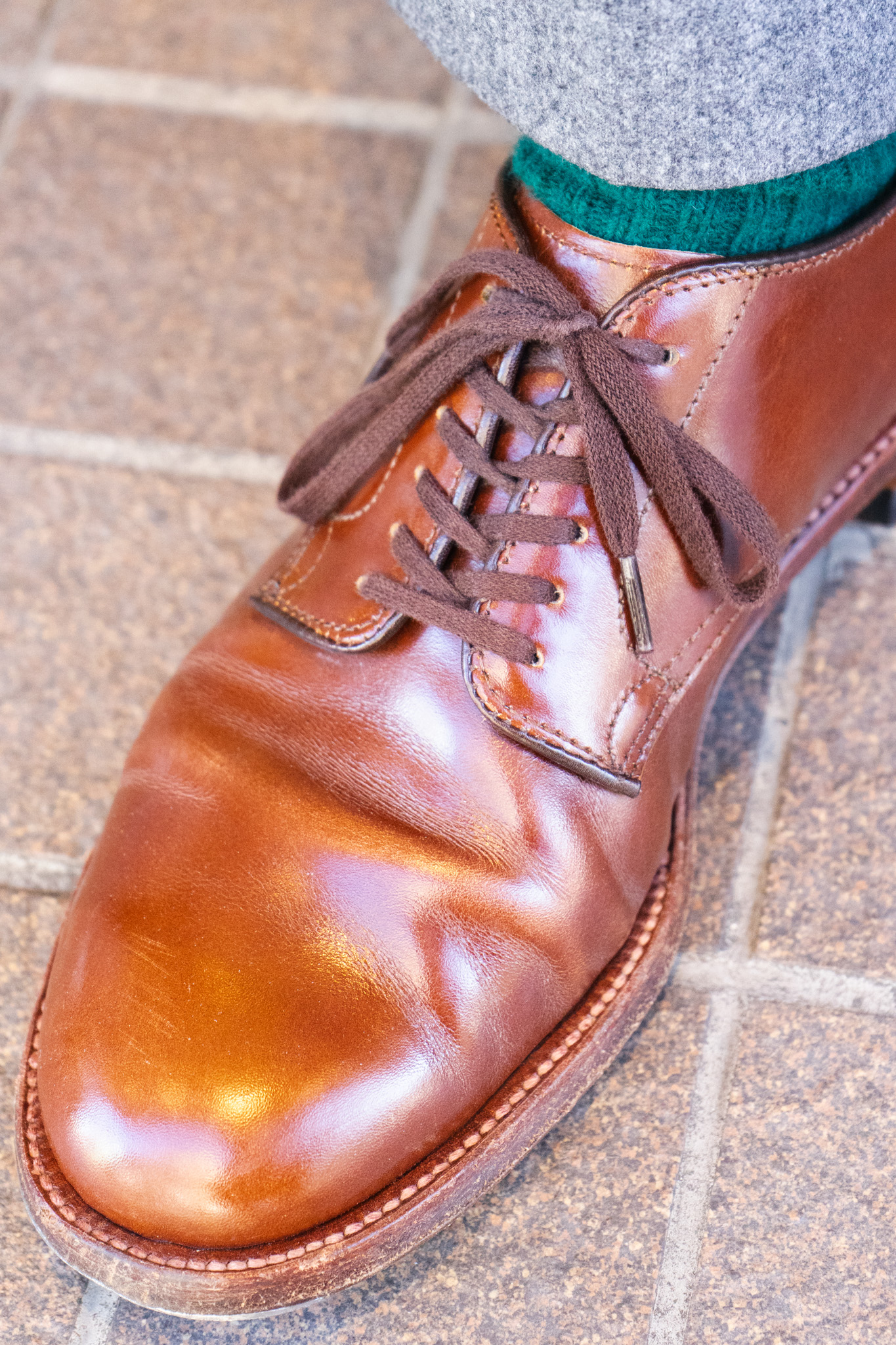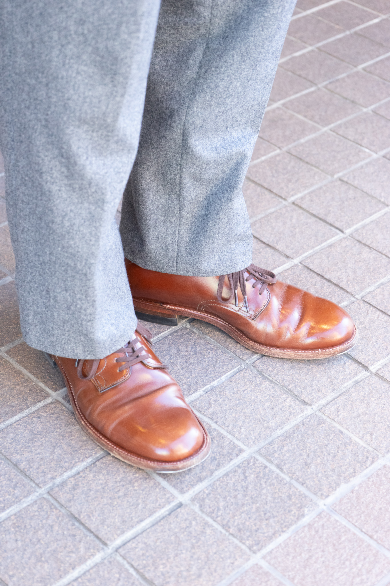 ヒールパッドの刻印は見えなくなるくらいになりました。こう見るとぼてっとした雰囲気がありますが、プレーントゥにシングルレザーソールなので綺麗なパンツとも相性〇です!