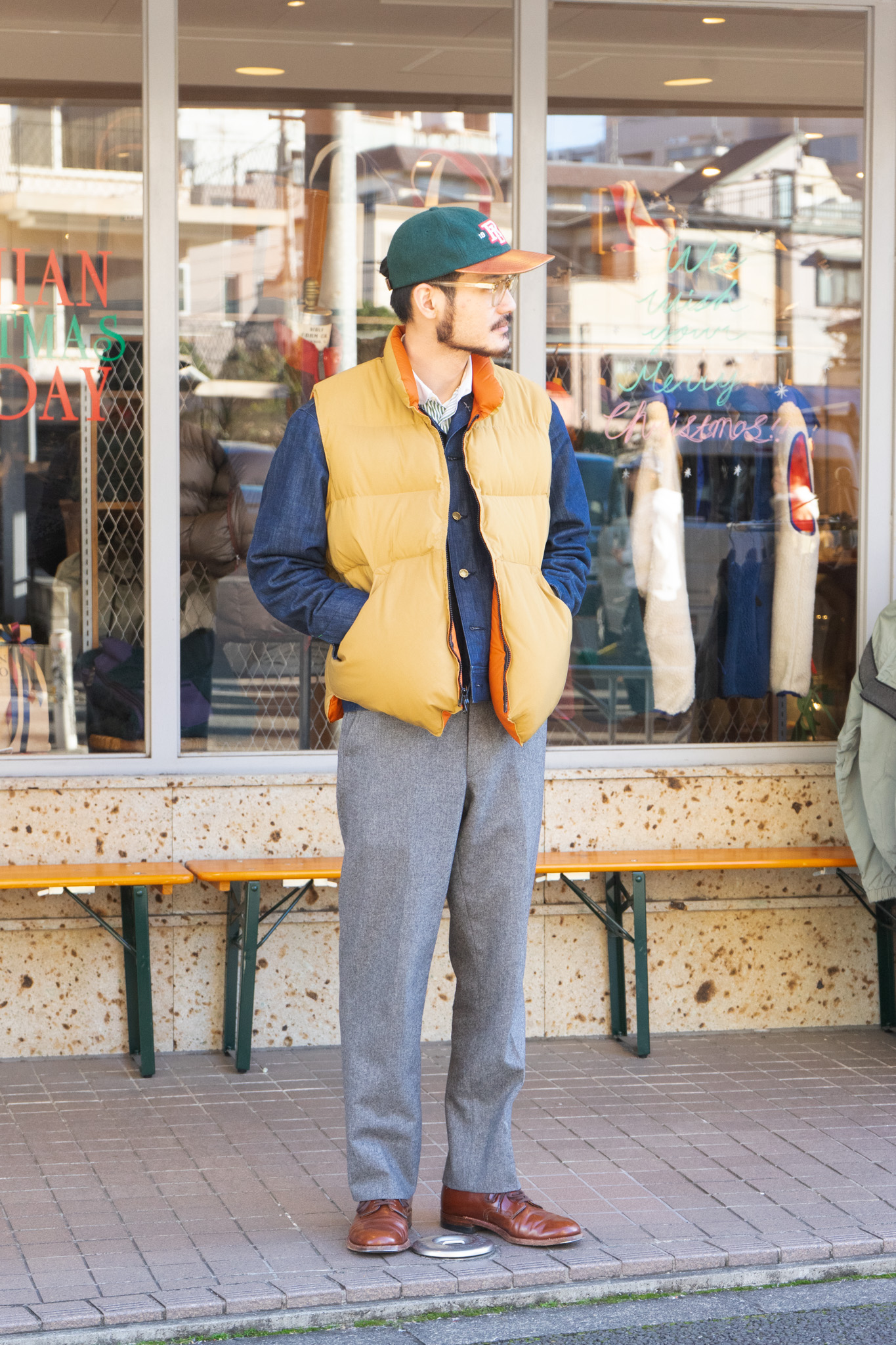 上がだいぶカジュアルなので下はHERTLINGのフランネルトラウザーでバランスをとっています。ミリタリー系のパンツと合わせたくなりがちですが、このようなキレイなパンツと合わせることが最近は多いです。