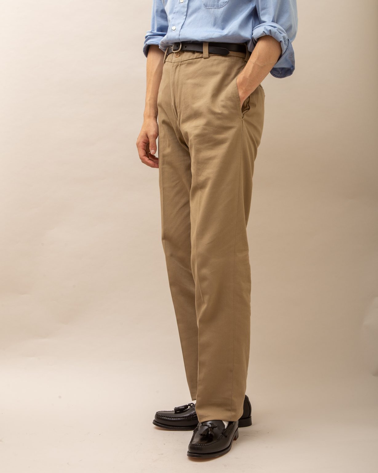 アメリカのカーキと言えばの深い股上、ゆとりのあるワタリから裾に向かって若干のテーパードがかかるシルエットです。