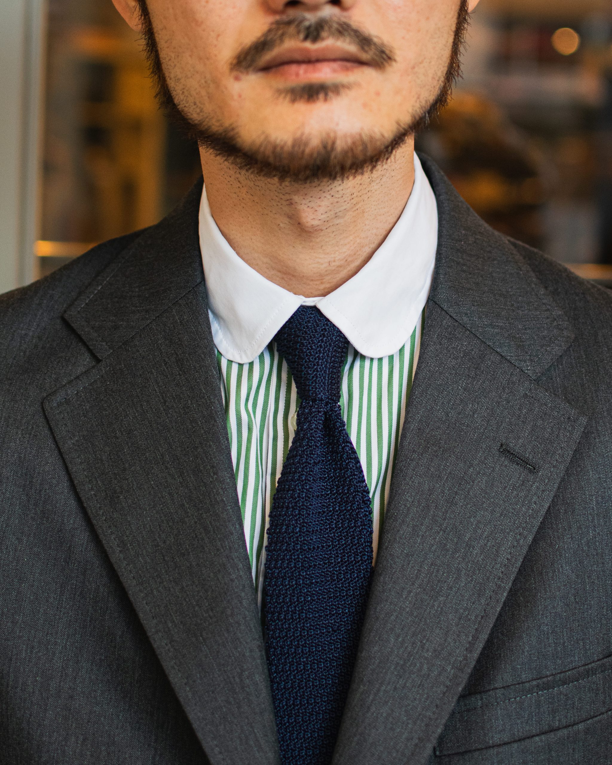 やはりスーツ、ジャケットを羽織るとカチッとするのでそれを和らげるというのが中々難しく感じてしまうのですが、丸襟がスーツの堅い印象を柔らかくしてくれています。
