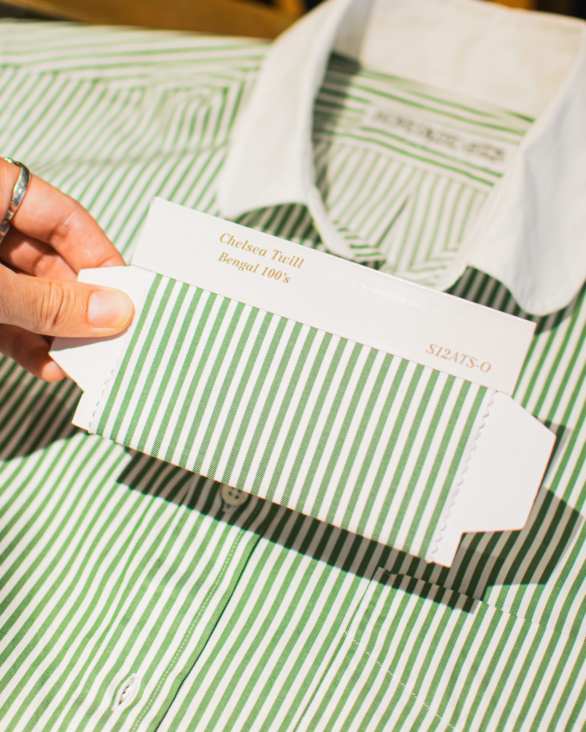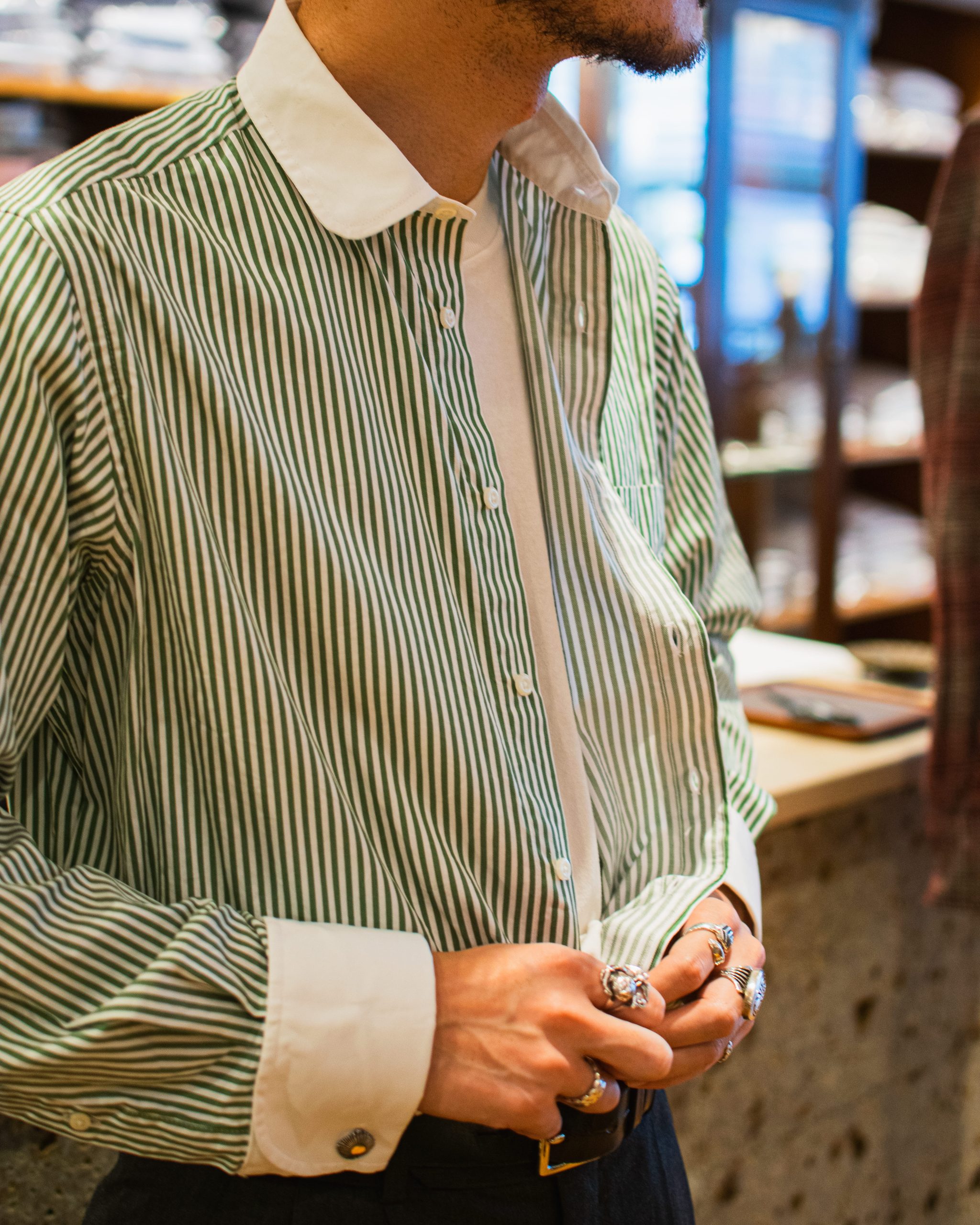 白襟、白カフですがかなり実用的なものです。シャツで傷みやすい部分がこの2箇所なのですが、例えばお手持ちのストライプ等のシャツの襟が破れてしまい、同じ生地で襟を交換しようとすると日焼けや洗いをしている状態なので本体と襟で色に違いが生まれてしまいます。なので白襟に変えてもらうと色の違いの違和感がなくなる。かつ今まで着用していたシャツの印象も変わるので違った味を楽しめるのが最高ですね。